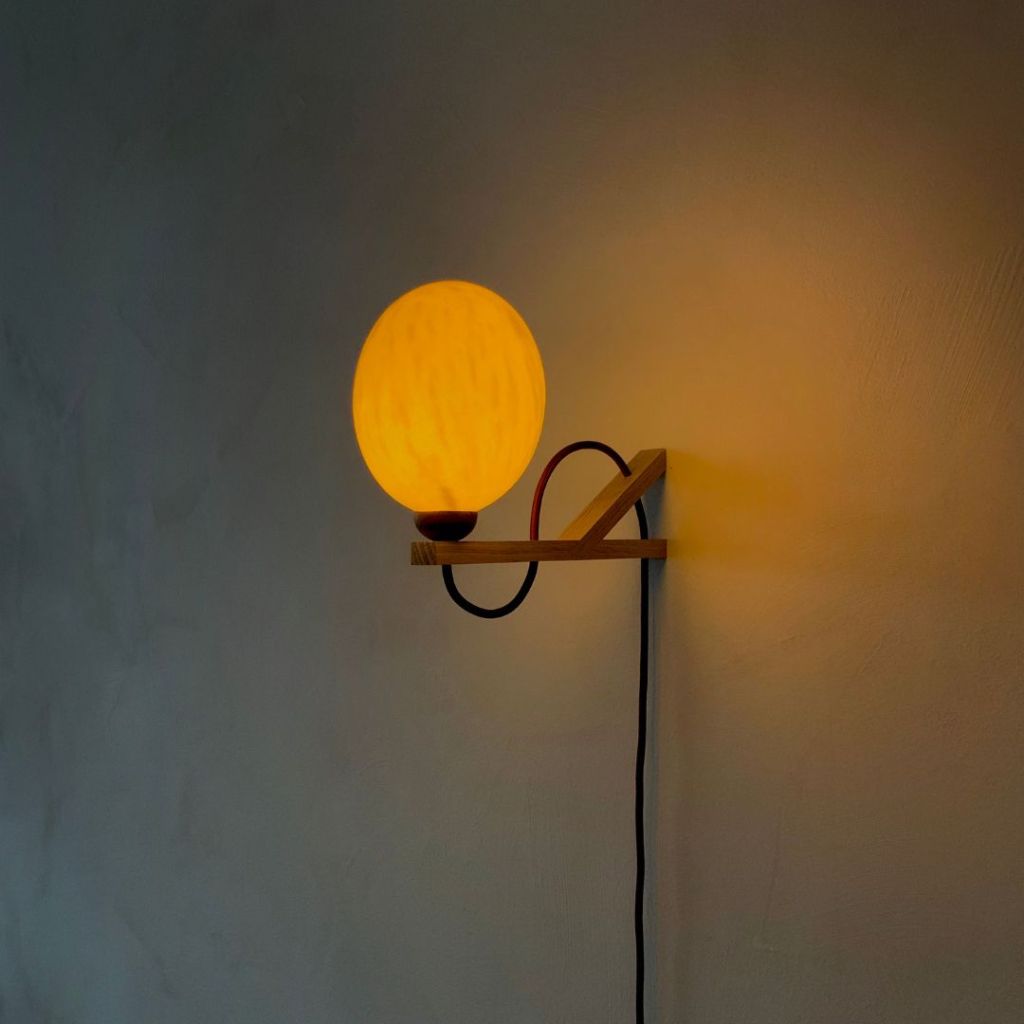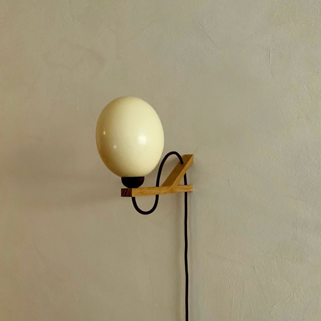 Lunar Lumin’s design is both modern and sculptural. This wall-mounted lamp is made from a genuine ostrich egg mounted on an oak and walnut wooden support. Lunar Lumin offers two distinctive variations, each with its own charm. In the Perched version(No. 1), the egg is nestled atop a walnut base, while in the Suspended version(No. 2), it gracefully hangs, adorned with a walnut cap.
